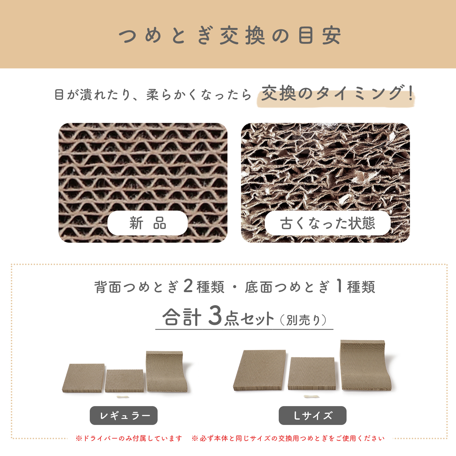 傷んだ部分だけを交換しながら、自分のにおいの染み込んだ、お気に入りのつめとぎを長くお使いいただけます。