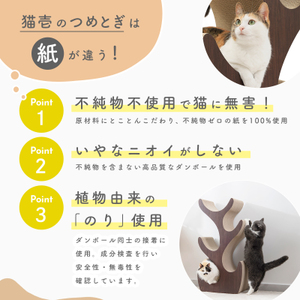 使用しているダンボールは、原料の100%が不純物を含まない紙を厳選使用しています。繊維密度の高い上質な紙にとことんこだわることで、研ぎカスが出にくく、丈夫で長持ちします。また、猫の好む硬さや肉球への触感になるよう開発を重ねてきました。ダンボールを貼り合わせる糊は植物由来の糊を使用し、大切な猫が毎日安心して楽しんでいただけるよう安全面にも配慮しています。