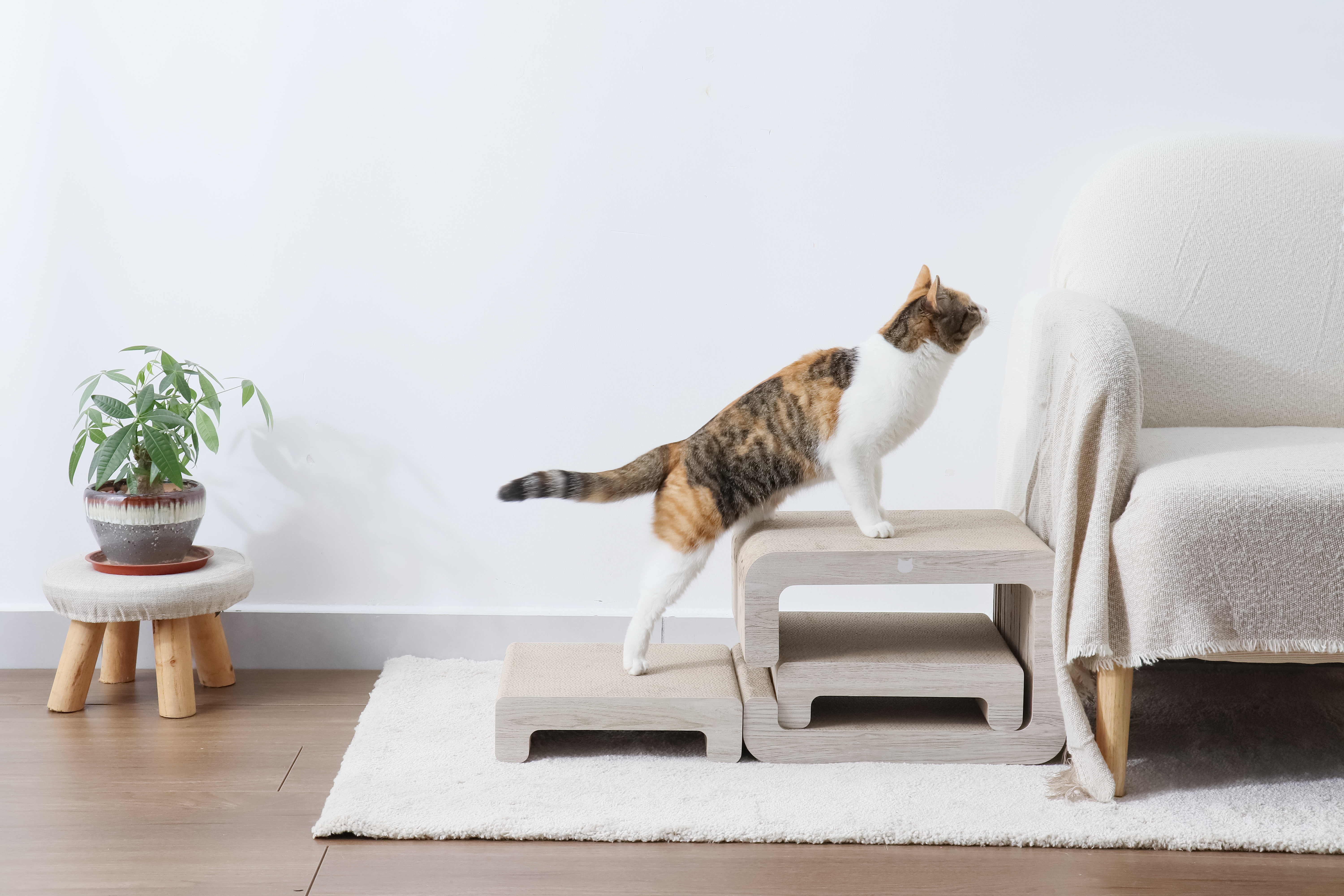 シニア猫が安心して高い場所への昇り降りを行え、爪とぎもできる新商品「バリバリステップ」を2025年2月14日に発売します。
