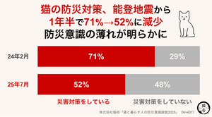 その結果、「猫のために防災対策をしている」と答えた人は52.3%にとどまり、昨年2月の調査(71%)と比べて約19ポイント減少していることがわかりました。2024年1月1日に発生した能登半島地震をきっかけに一時高まった防災意識が、1年半を経て薄れつつある実態が明らかになりました。